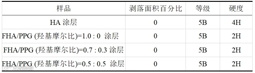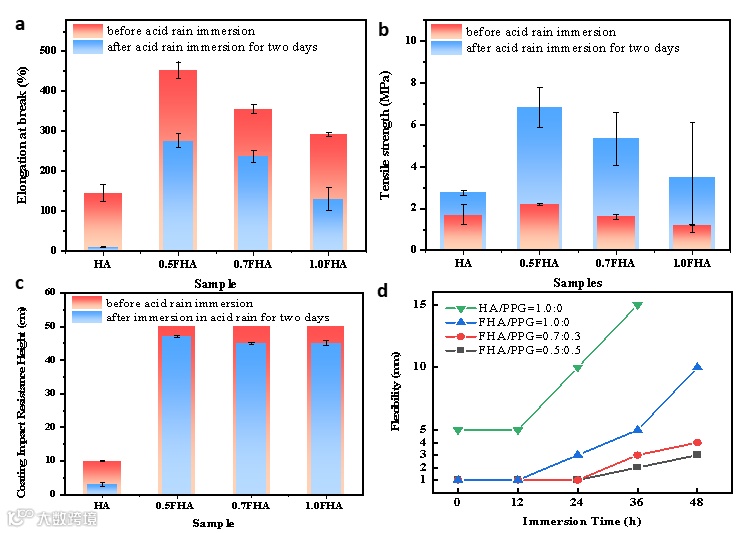 表1和图2是FHA弹性体的性能表征结果。随着PPG用量增加,涂层断裂伸长率和拉伸强度增加,而弹性模量降低,可以吸收应力变形并抵抗雨滴冲击。在pH=4模拟酸雨中浸泡48小时后,与羟基丙烯酸乳液(HA)涂层相比,FHA涂层仍然保持更好的柔韧性、抗冲击性和机械强度。