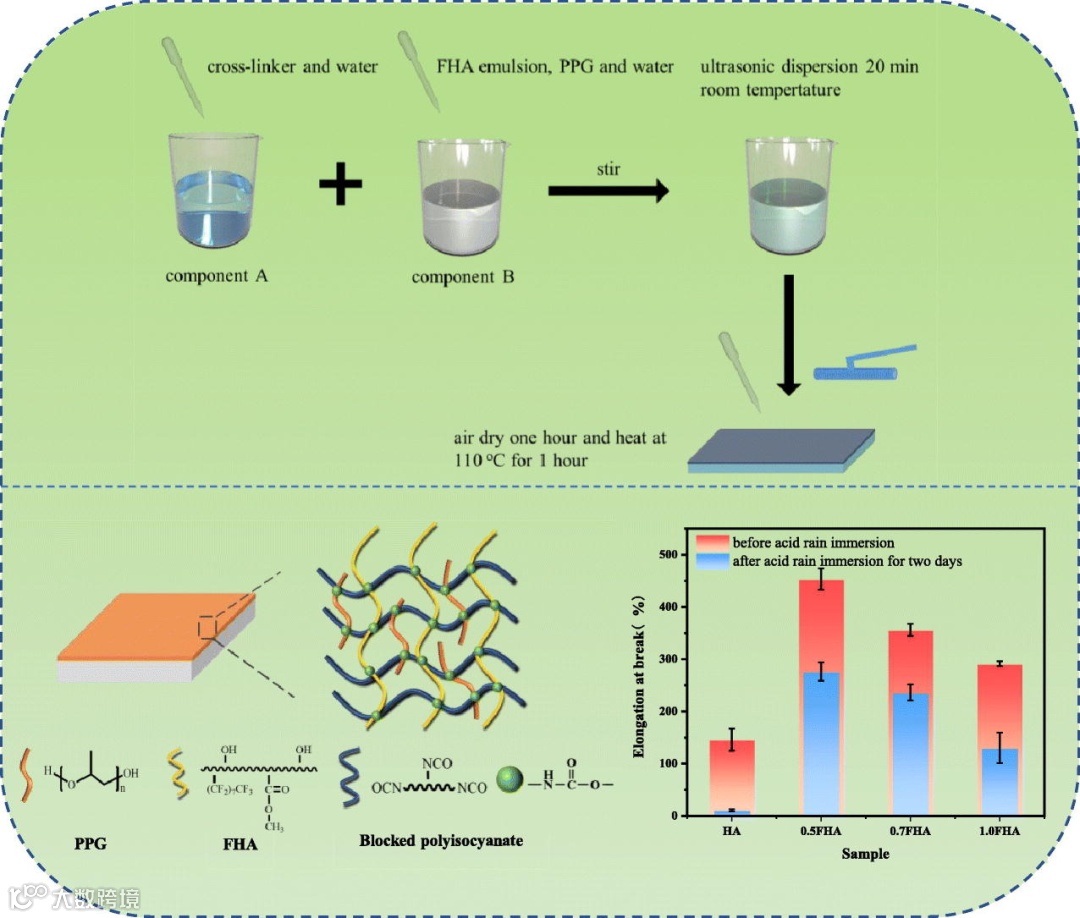 雨水侵蚀的核心机理是:一方面,沿海地区的雨水一般呈弱酸性,长期酸雨浸润导致聚丙烯酸酯的酯键水解,导致涂层脱落,另一方面,雨水高速冲击导致脆性涂层开裂,进一步加速了涂层水解。因此涂层必须具有稳定疏水性和弹性。该论文以低Tg的含氟羟丙乳液(FHA)为基质、水溶性聚醚多元醇(PPG)为弹性成分、水性封闭型多异氰酸酯为交联剂,通过优化配方和工艺,成功制得了具有高弹性、稳定疏水、优异抗雨蚀性能的涂层。FHA乳液凭借其含氟特性,赋予了涂层良好的疏水性,能有效阻止雨水的侵蚀。PPG则为涂层增添了出色的弹性,使其在面对雨滴的高速冲击时,能通过弹性变形来缓冲冲击力,减少损伤。封闭型多异氰酸酯能够将FHA和PPG以及环氧树脂基底紧密地交联在一起,形成一种稳固的结构(图1)。