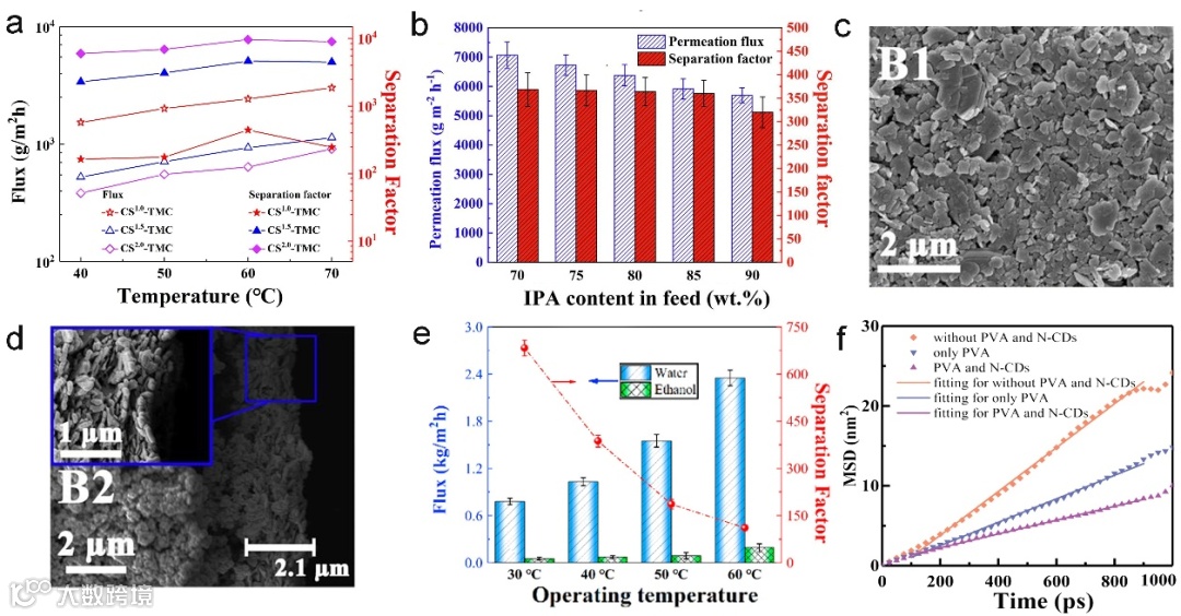 图12展示了操作条件与膜结构对渗透汽化性能的影响:(a)为不同壳聚糖(CS)浓度下复合膜在40–70 °C操作温度范围内的PV性能;(b)为进料中异丙醇(IPA)含量对343 K下PV测试性能的影响;(c-d)为剥离态MoS₂纳米片(厚度约1.1 nm)构建的TFC膜厚度表征;(e)为操作温度对PV膜分离性能的影响;(f)为分子动力学模拟结果,展示EDA在三种不同膜中的扩散系数对比。