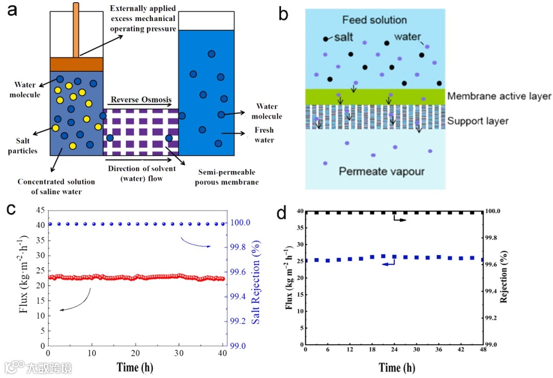 图13展示了反渗透与渗透汽化脱盐过程中的质量传输行为及膜性能:(a)为反渗透(RO)过程中水分子穿过膜的质量传输路径;(b)为渗透汽化(PV)脱盐过程的传质机制示意图;(c)为在10 wt% NaCl条件下,ACQD-TFN(50 wt%)膜与PA-eGO复合膜的PV长期脱盐性能对比;(d)为在3.5 wt% NaCl、70 °C操作条件下的PV脱盐性能测试结果。