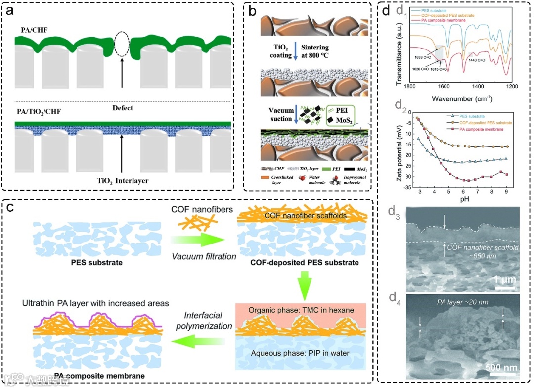 图7展示了多种中间层材料在不同支撑层上的构筑与膜性能表征:(a)为TiO₂中间层在CHF支撑层上的分布情况;(b)为MoS₂中间层在CHF支撑层上的形貌;(c)为COF中间层在PES支撑层上的结构示意;(d)包含不同膜的(d1-d2) ATR-FTIR光谱与Zeta电位测试结果,以及(d3-d4) 聚酰胺复合膜的截面结构图像。