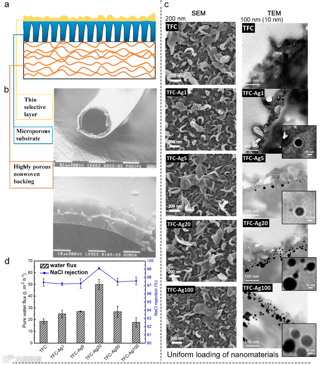 图3展示了典型TFC膜结构及其在渗透汽化中的应用表现:(a)为传统TFC膜的结构示意图,标示出各功能层的典型特征;(b)为首次应用于渗透汽化的IP膜,展示了中空纤维膜横截面的扫描电镜图像,上图为聚苯胺涂层膜,下图为聚二乙烯苯涂层膜;(c)为对比TFC膜与掺银(Ag)TFC膜的SEM及TEM截面图像;(d)为不同类型TFC膜的分离性能测试结果