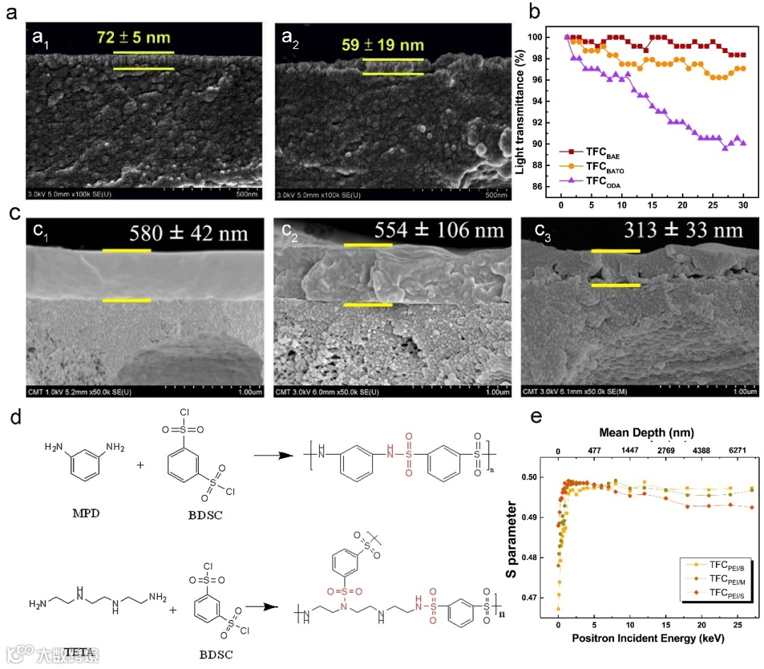 图4展示了不同IP膜的结构特征及性能评价方法:(a)为NBDC/mPAN复合膜的结构图;(b)通过光透过率变化反映聚酰胺反应速率;(c)为三种不同单体体系制备的TFC膜的SEM图像,分别为(c1) TFCBAE、(c2) TFCBATO 和 (c3) TFCODA;(d)为MPD/BDSC与TETA/BDSC两种单体体系在IP过程中的聚合产物示意图;(e)为基于正电子湮没寿命谱(PALS)测试的膜材料参数与正电子入射能量的关系图.