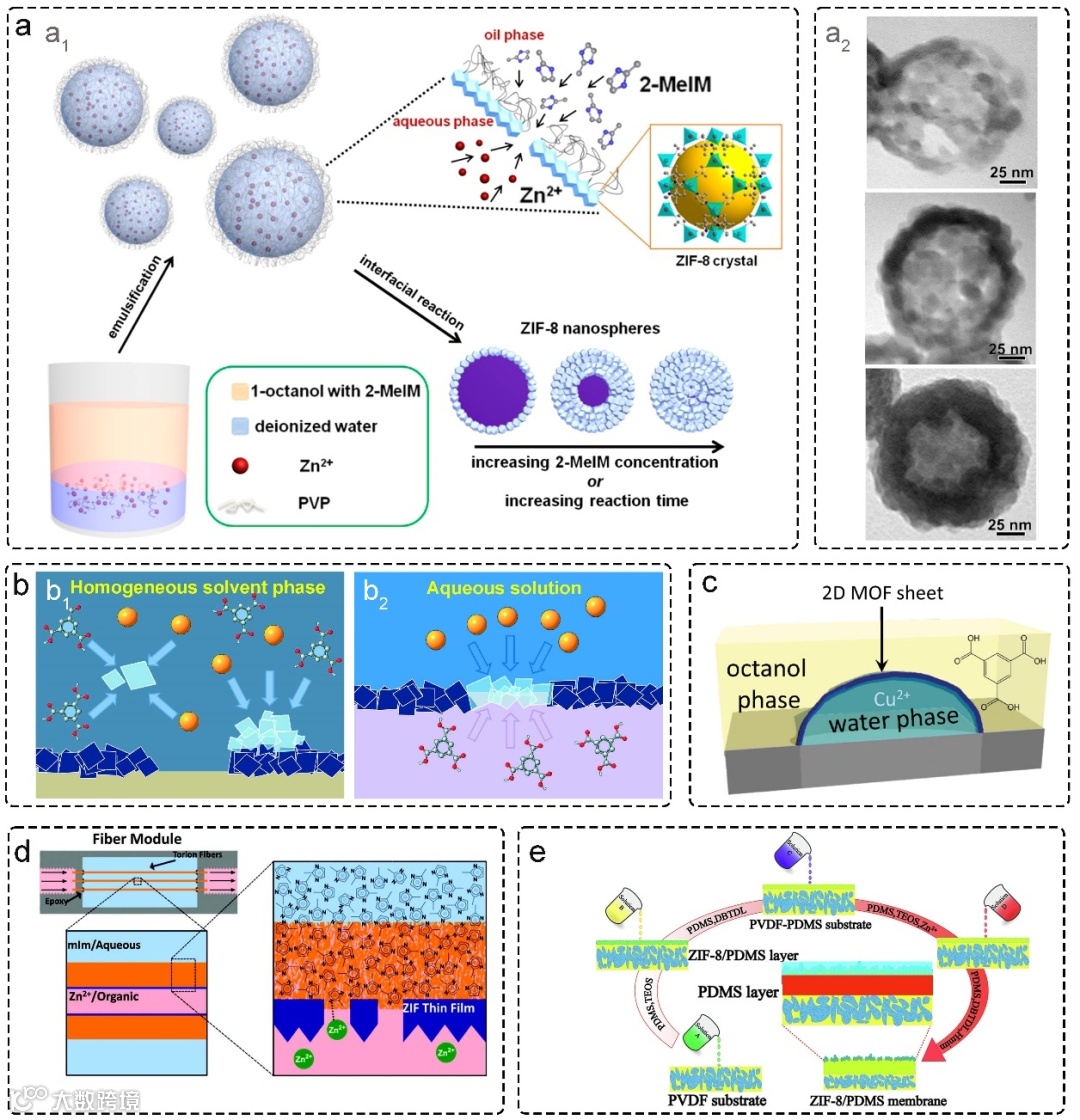 图8展示了基于MOF材料的界面聚合过程与膜构筑策略:(a1)为中空ZIF-8纳米球的结构图,(a2)为在不同IP单体浓度下的对应TEM图像;(b)为MOF膜合成的多种策略,其中(b1)为MOF层在基底上的沉积过程,(b2)展示了MOF层参与的界面聚合过程,图中橙色球表示金属离子,蓝色八面体代表MOF晶体,深蓝色八面体为已形成结构;(c)为二维MOF片层的生长示意图;(d)展示了中空纤维中MOF膜的界面微流控构建方法;(e)为ZIF-8@MMM膜的多种合成策略示意图。