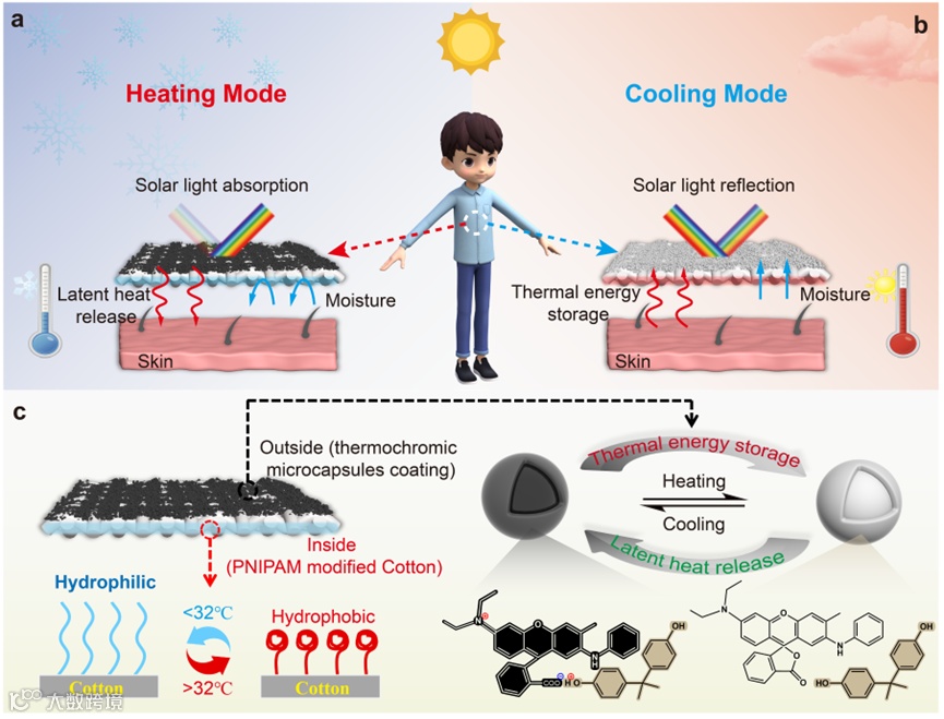 随着社会经济发展和生活水平提高,人们愈发重视个人健康和身体热舒适。经济增长依赖化石燃料,进而引发温室效应和极端天气,严重威胁人类生活,全球温室气体排放可能导致21世纪全球气温上升超1.5℃。传统纺织品功能单一,无法适应动态气候变化,在不同温度环境转换时,易使人体产生不适并可能引发健康问题。织物基个人热湿管理技术可调节体温,但现有动态热管理纺织品,如辐射冷却、加热织物、温湿度响应织物等,大多只能在高温或低温下单一地制冷或制热,无法根据环境变化有效调节人体温湿度。具有Janus润湿性的纺织品虽能改善汗液管理,但仍存在局限性。因此,开发动态调节个人热湿舒适性的纺织品仍然是一个挑战。