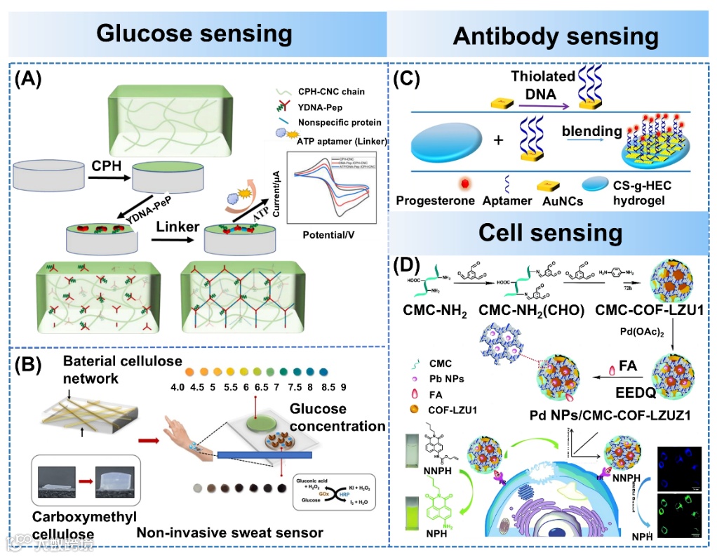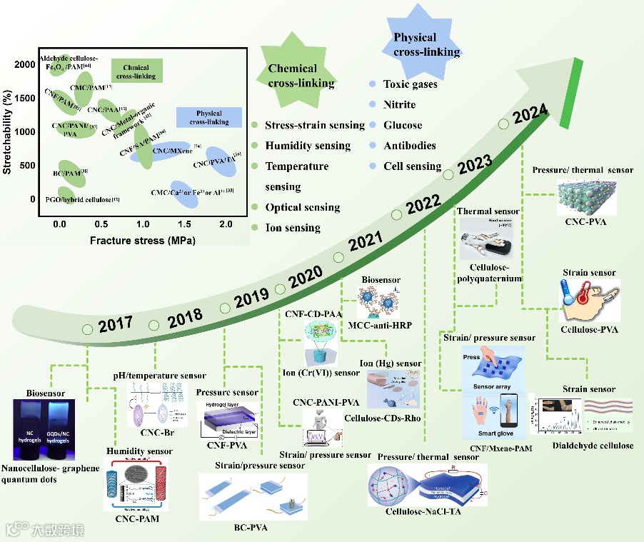 随着工业化和智能化的发展,柔性传感器具有出色的形状适应性和变形能力,已被应用于环境监测、医疗诊断、食品安全、智能系统和人机交互等领域。纤维素基水凝胶具有独特的三维结构、可再生性、易加工性、可生物降解性、和良好的机械性能,是柔性传感器的理想材料。