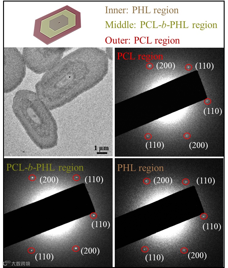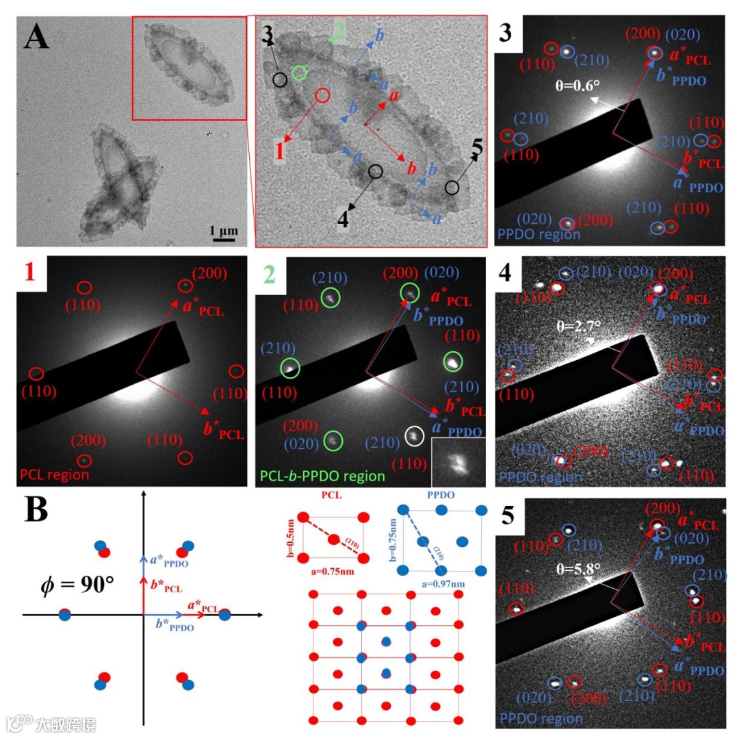图3. 二维分段式纳米片(flat-on)的TEM、不同区域的SAED图像以及PCL/PPDO空间点阵匹配示意图。