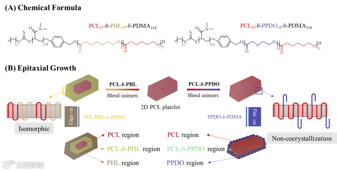 具体地,以PCL作为第一结晶组分,PPDO、PHL分别作为第二结晶组分(PCL/PPDO独立结晶,而PCL/PHL共结晶),PDMA作为壳层溶剂稳定组分,合成两种类型的双结晶三嵌段共聚物作为模型聚合物,即PCL33-b-PPDO18-b-PDMA316和PCL37-b-PHL45-b-PDMA218。以二维PCL片为晶种分别诱导以上两种聚合物的附生结晶,发现PCL37-b-PHL45作为整体在二维PCL晶体生长前沿共结晶,从而形成平面内的多组分附生晶体层;而PCL33-b-PPDO18呈现序列结晶行为,即PCL链段在二维PCL晶体外附生结晶之后,PPDO链段在PCL晶体上下表面发生结晶,从而形成平面外的flat-on晶体(图2)。