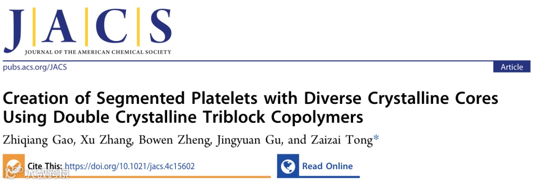 上述研究工作以“Creation of Segmented Platelets with Diverse Crystalline Cores using Double Crystalline Triblock Copolymers”为题发表在《Journal of the American Chemical Society》期刊上,DOI:10.1021/jacs.4c15602。浙江理工大学材料科学与工程学院硕士高智强为第一作者,童再再教授为通讯作者。该研究工作得到了国家自然科学基金以及浙江理工大学基本科研业务费专项资金的资助。