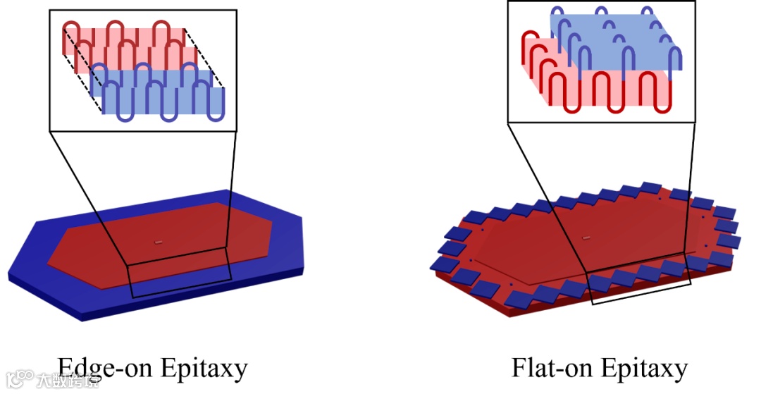 高分子附生结晶是结晶高分子在晶体基底上的取向结晶行为,根据结晶高分子与晶体基底之间的化学组分,可分为同质附生结晶和异质附生结晶。在晶格匹配的作用下,附生生长的晶体和结晶基体具有高度一致的取向性,因此附生结晶是调控高分子材料多层次有序结构的有效方法。例如,种子生长是一种典型的附生结晶行为,在溶液中加入嵌段共聚物均相溶液至预先存在的晶种上,通过附生结晶机理会自发地形成结构明确、尺寸均一的核壳一维/二维纳米材料,该过程也被称为“活性结晶驱动自组装”(living CDSA)。对于高分子二维片晶结构,附生结晶往往发生在晶体生长前沿,即侧立附生结晶(edge-on epitaxy);而在二维片晶结构的上下表面因为存在链折叠环形结构、非晶链段等表面缺陷,在晶体上下表面取向成核往往具有较高的能垒,因此flat-on附生结晶很难发生(图1)。基于该问题,浙江理工大学童再再课题组通过结晶高分子的合理设计,合成双结晶性三嵌段共聚物,通过双组分结晶嵌段的顺序结晶,迫使第二结晶链段悬挂在先结晶的晶体上下表面,随后在晶格匹配的作用下形成取向的flat-on附生晶核,继而引发晶体生长,从而构筑具有多组分的分段式高分子二维纳米片。该策略构筑的多组分二维纳米片突破了异质附生结晶的条件限制,为构筑多组分、多功能集一体的高分子纳米材料提供了新方法和新思路。