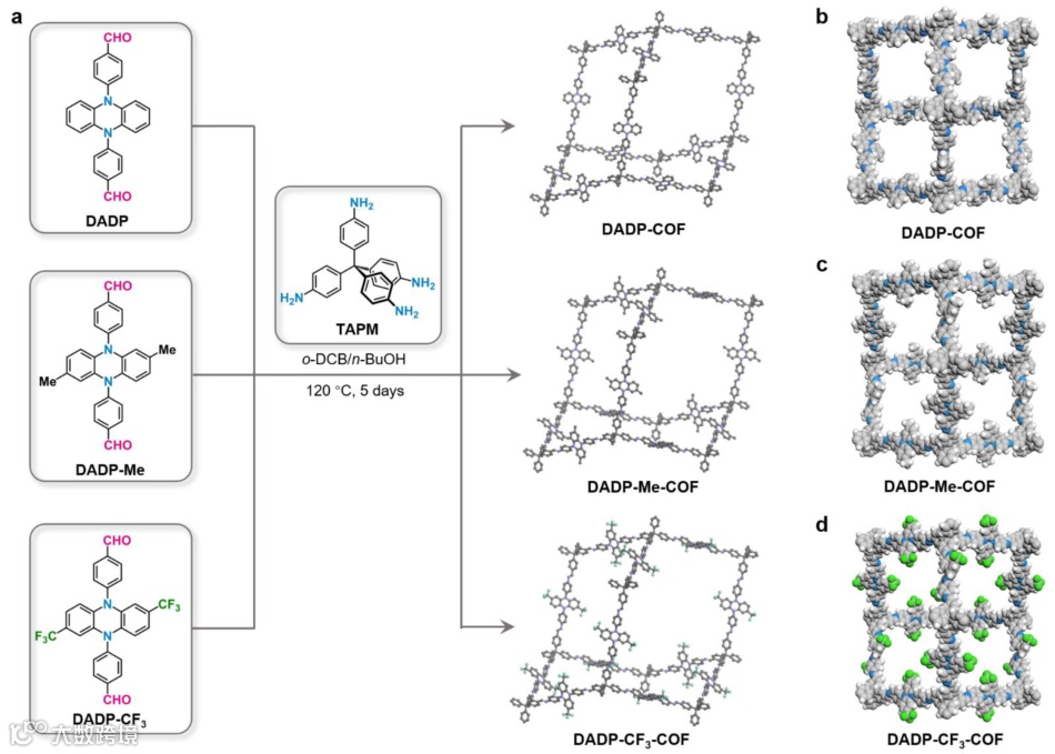 图1. (a) COFs的合成路线;(b) DADP-COF、(c) DADP-CF₃-COF和(d) DADP-Me-COF的结构示意图(碳-灰色,氮-蓝色,氢-白色,氟-绿色)。