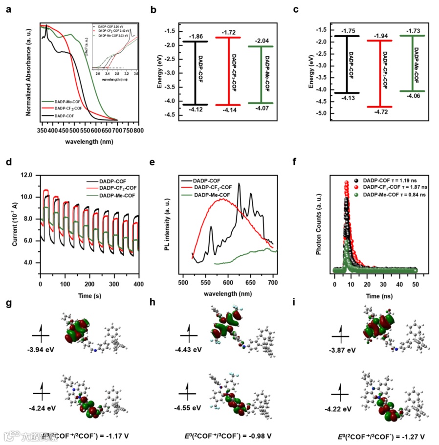 图3. (a) 紫外-可见光漫反射光谱(黑:DADP-COF,红:DADP-CF3-COF,绿:DADP-Me-COF,内部:Tauc图);(b)结合Tauc图和莫特-肖特基曲线计算得到的能级;(c) 密度泛函理论(DFT)模拟计算得到的能级;(d) 光电流响应曲线;(e) 光致发光光谱;(f) 时间分辨光致发光光谱;(g) DADP-COF、(h) DADP-CF3-COF和(i) DADP-Me-COF模拟计算三重态激发态前沿轨道(上:高位单电子占据分子轨道;下:低位单电子占据分子轨道)。