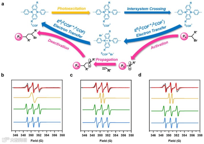 电子顺磁共振(EPR)分析证实,光激发产生的COF自由基(·COFs)通过单电子转移活化引发剂,形成活性链自由基(Pₙ·),从而驱动聚合反应(图5)。取代基的吸电子效应(如-CF₃)增强了COFs的氧化还原电位,促进了激子寿命和催化效率。
