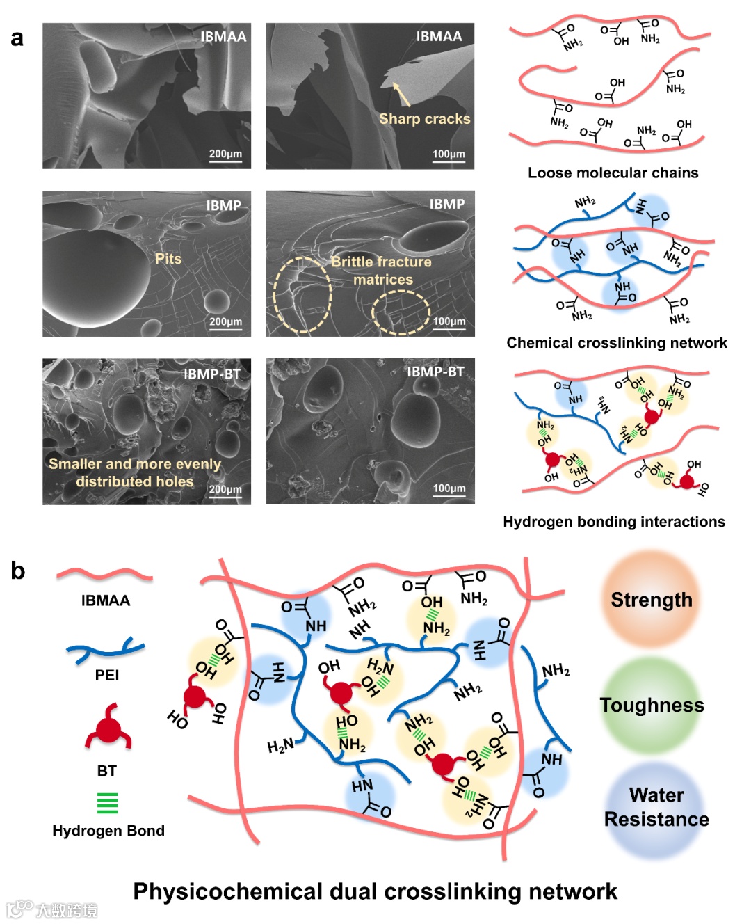 他们认为通过物理化学双重交联构建协同网络是提升胶黏剂胶接强度的关键因素(图4):(1)在热压过程中,PEI中氨基与IBMAA中羧基发生亲核取代反应,最终形成酰胺键,从而构建稳定的化学交联网络,这是提升胶黏剂粘结力的核心机理。(2)BT的酚羟基与IBMAA和PEI中的其他基团(如酰胺、氨基等)形成多重氢键网络,这种物理交联网络不仅提高了胶黏剂粘结结构的稳定性,还通过非共价“牺牲键”机理,进一步提高了胶黏剂的韧性。(3)物理网络提供的动态保护与化学网络的稳定性相结合,形成多层渗透屏障,保证了胶黏剂在潮湿环境下的结构完整性和稳定性,有效增强了胶黏剂的耐水性。