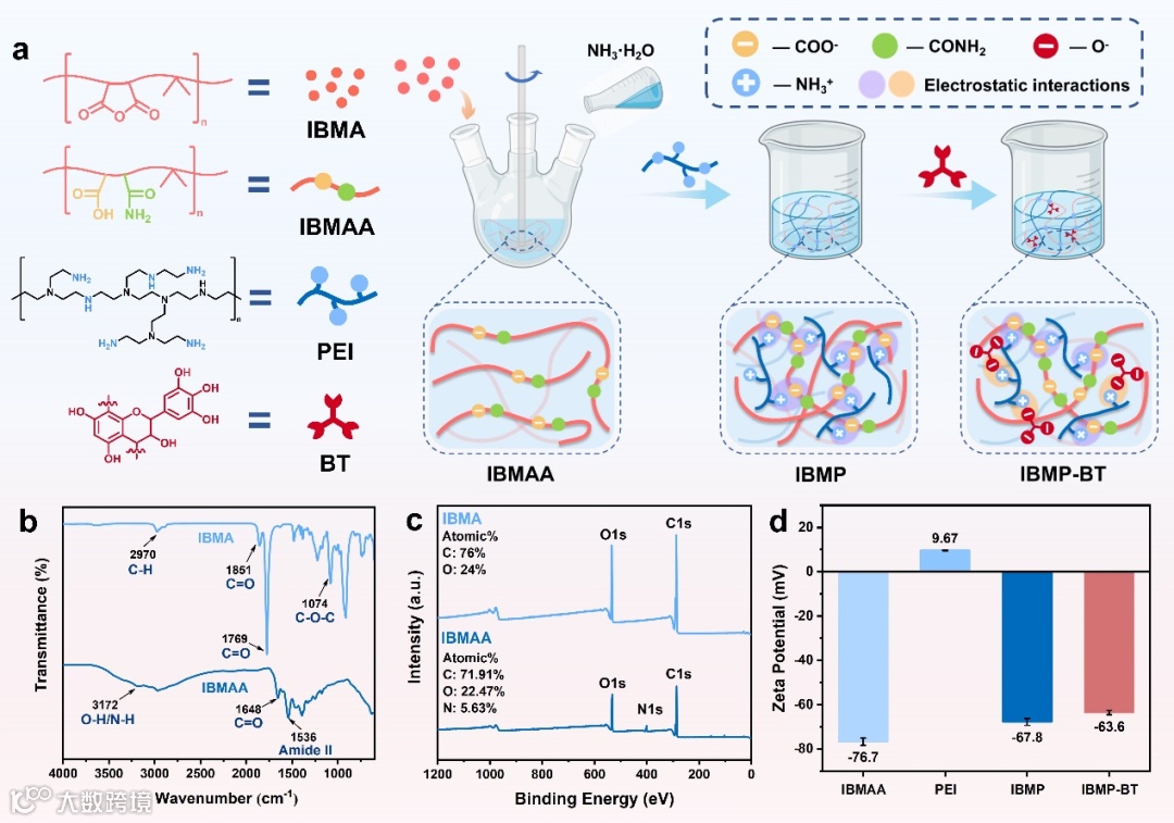 传统胶黏剂因含甲醛而危害人体健康和环境,但现有无甲醛胶黏剂普遍面临两大难题:耐水性不足和机械性能弱。此外,石油基原料依赖和复杂合成工艺也限制了其大规模应用。团队以异丁烯-马来酸酐共聚物(IBMA)、聚乙烯亚胺(PEI)和杨梅单宁(BT)为原料,开发出新型无醛胶黏剂,为行业提供绿色解决方案。