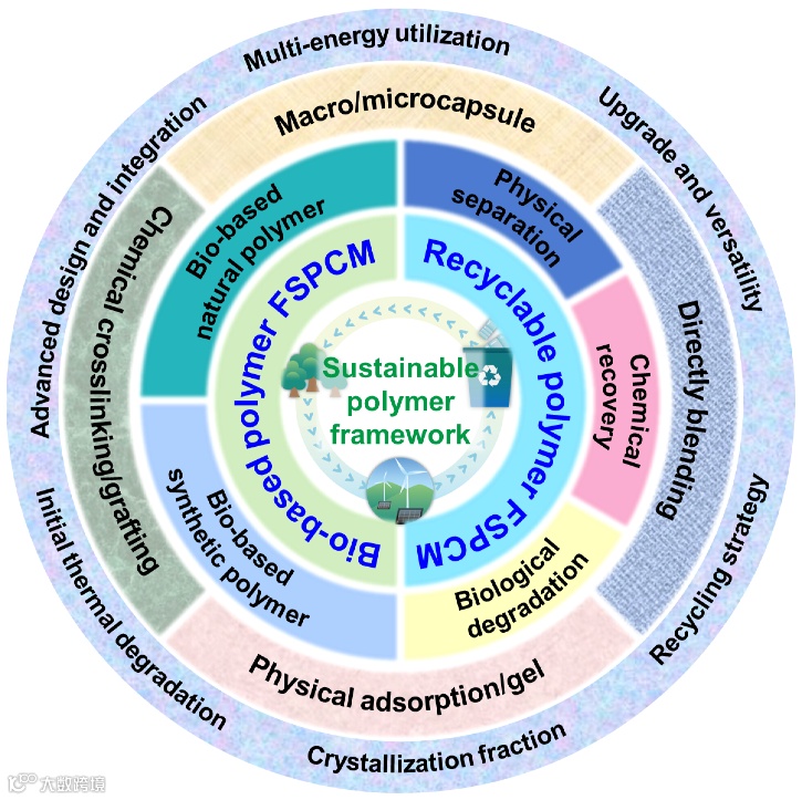 基于团队在可持续高分子和相变储热材料方面的研究基础,近期,该团队在《Progress in Materials Science》上发表了题为“Integration of sustainable polymers with phase change materials”的综述性论文。文章聚焦于可持续聚合物(生物基/可回收聚合物)基FSPCM的最新进展(图1),包括从生物基化学品到生物基聚合物基体的制备方法和封装策略、性能升级和影响因素、多能利用和先进应用。同时,还总结了可回收聚合物基FSPCM的设计方法和回收策略,并对高效回收路径提供了见解。此外,还提出了基于结晶分数和热稳定性这两个关键技术参数的相变性能分析视角,并总结了结构-性能影响规律及其优化策略。最后,从全生命周期的角度,提出了可持续聚合物基FSPCM的新兴研究方向。