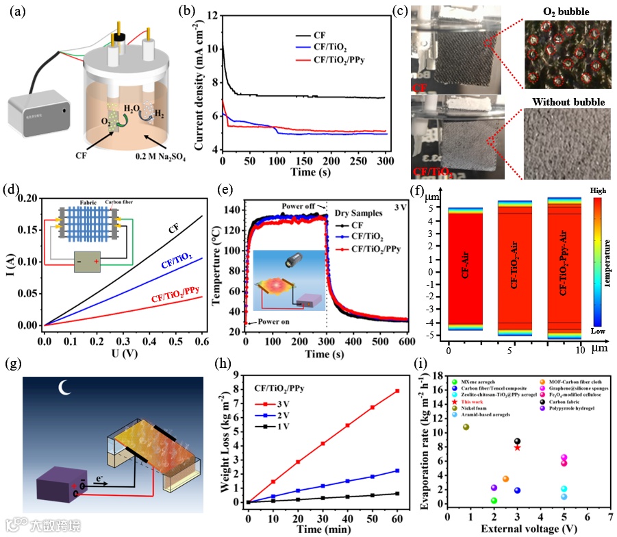 CF/TiO2/PPy织物能有效地抑制水的电解,并展现优异的电热转换性能(图3)。由于TiO2-壳的屏蔽作用,CF/TiO2/PPy织物能有抑制电子进入水体,减少织物表面气泡的生成。此外,得益于碳纤维的高导电性和TiO2-壳的有效传热,CF/TiO2/PPy织物实现了高效的电热蒸发海水,在3 V电压下,其蒸发速率达7.9 kg m-2 h-1,优于目前大多数电热蒸发材料。
