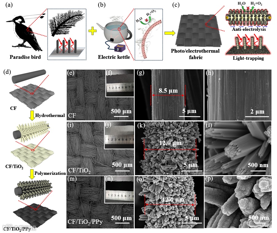 近期,东华大学陈志钢教授团队仿生设计了由碳-芯/纳米棒阵列-壳纤维构成的光热-电热织物,用于高效全天候海水蒸发。众所周知,天堂鸟具有超黑的羽毛,光吸收率高达99.99%,起源于分等级结构带来的陷光效应(图1 a)。另外,电热水壶能通过电热效应加热水,但是不会电解水,起源于加热模块的导电核-绝缘壳层结构(图1 b)。受到天堂鸟羽毛和电热水壶的启发,设计和制备了一种具有陷光结构且抗电解水的光热-电热织物用于全天候海水蒸发(图1 c)。该织物以高导电性的碳纤维(CF)作为核,通过水热和化学聚合两步法在其表面生长二氧化钛@聚吡咯(TiO2/PPy)纳米阵列涂层(图1 d)。该织物兼具了天堂鸟超黑羽毛和电热水壶加热模块的优势,集成了多级太阳光吸收和抗电解水的功能,提高了太阳光和电能的利用,实现了高效的光热-电热蒸发性能,为全天候海水淡化提供了新途径。