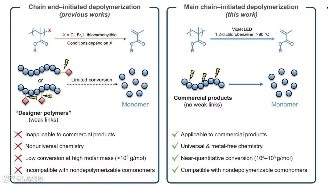 由于聚甲基丙烯酸甲酯(PMMA)的化学稳定性和碳碳主链,其解聚长期以来一直是一个难题。本文介绍了两种主要的解聚策略:链端引发解聚和主链引发解聚。传统的链端引发解聚依赖于在中等温度下促进解聚的不稳定端基。然而,本文描述的新方法引入了一种可见光引发的主链引发解聚策略,克服了传统方法的局限性。该过程允许解聚独立于聚合物的合成路线、分子量和端基功能进行。(图1)说明了传统链端引发方法与新引入的主链引发方法之间的根本区别。左图表示链端引发过程,需要在聚合物末端有特定的弱链接。右图显示主链引发方法,该方法不需要不稳定基团,因此能够实现商用PMMA 的解聚。