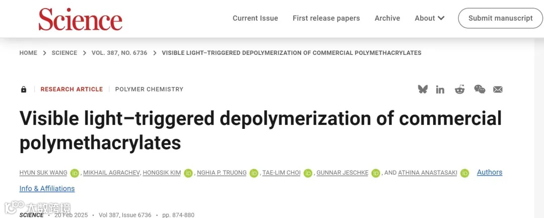 2025年2月20日,相关研究以题为“ Visible light–triggered depolymerization of commercial polymethacrylates”的论文发表在Science上。