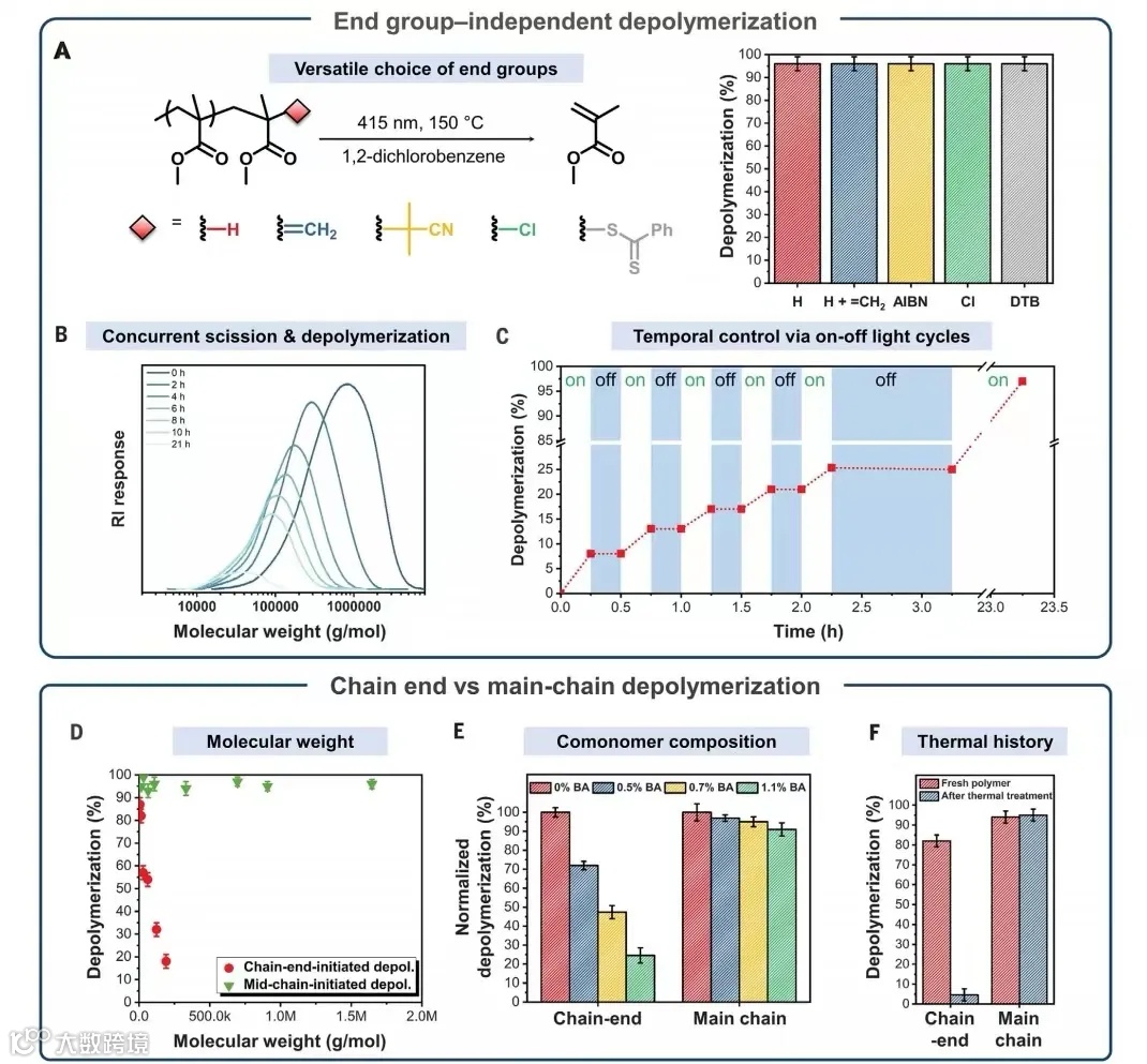 该研究通过直接从溶剂中原位生成氯自由基,无论聚甲基丙烯酸酯的合成途径(例如自由基或离子聚合)、端基和分子量(高达160万道尔顿)如何,都可以实现近定量(>98%)的解聚。进行多克级解聚并赋予时间控制的可能性使该方法成为一种通用的回收途径。