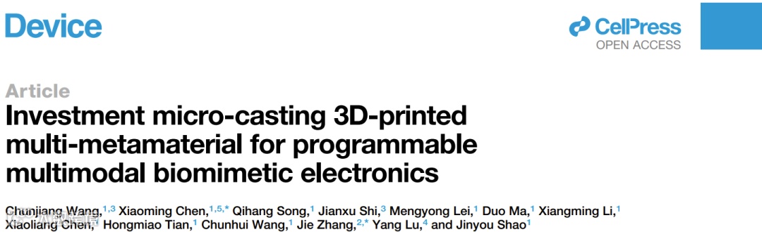 2025年1月9日,相关论文以题为“Investment micro-casting 3D-printed multi-metamaterial for programmable multimodal biomimetic electronics”发表Cell Press细胞出版社旗下旗舰期刊Device上。文章第一作者为Chunjiang Wang,西安交通大学机械工程学院陈小明教授、电信学部张洁副教授为论文共同通讯作者,西安交通大学为第一单位,文章得到了香港大学机械工程系陆洋教授的合作支持。