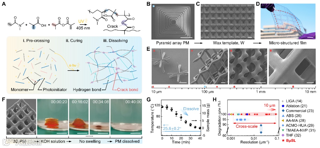 作者研究了BμSL方法中的关键工艺步骤(图2):可溶性光敏树脂的合成及微尺度结构打印。通过研究并调控树脂组成及曝光成型规律,实现常温常压下无明显溶胀的光固化“蜡模”制造,最小成形尺寸可达10 μm。与LIGA刻蚀及其他可溶可打印的高分子体系对比,该树脂体系可裂解成盐并溶于水,无固体残余,在裂解率和最小成型尺寸上具有明显的优势。