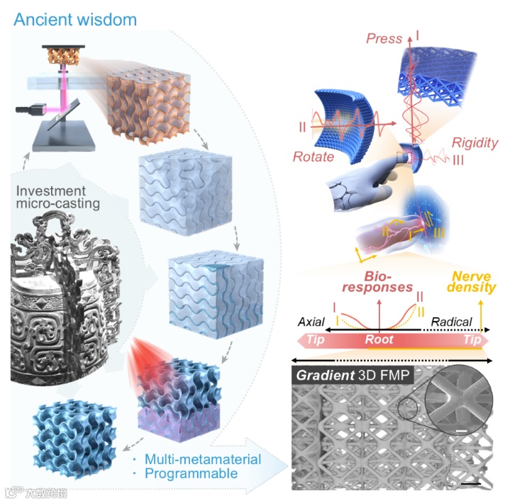 早在两千年前的春秋时期,失蜡法便用于铸造结构复杂、配比多样的青铜器。若能通过微尺度3D打印制备可溶化“蜡模”,进而获取空心“模骨”后注入功能材料,则可制造结构复杂、种类多样的超材料电子器件,对多类型、高性能、难成型器件的制造具有重要意义。