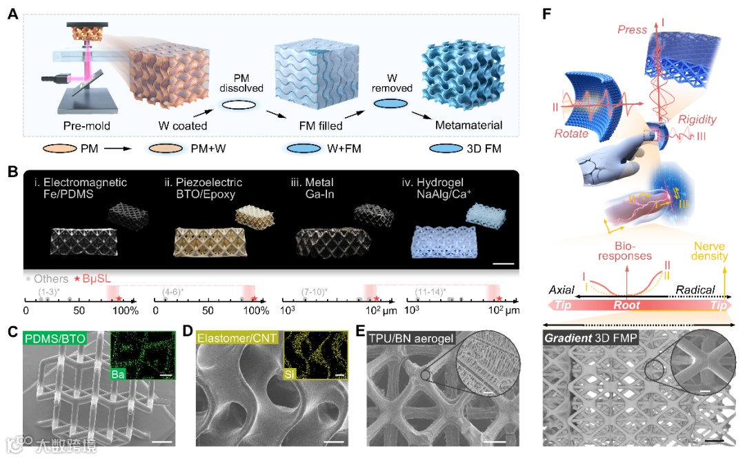 超材料通过各结构单元的特异性组合,为仿生电子器件的多模态集成与解耦提供实现路径。然而,制造工艺和功能材料的不匹配严重制约电子器件的材料与制造手段的选择范围。