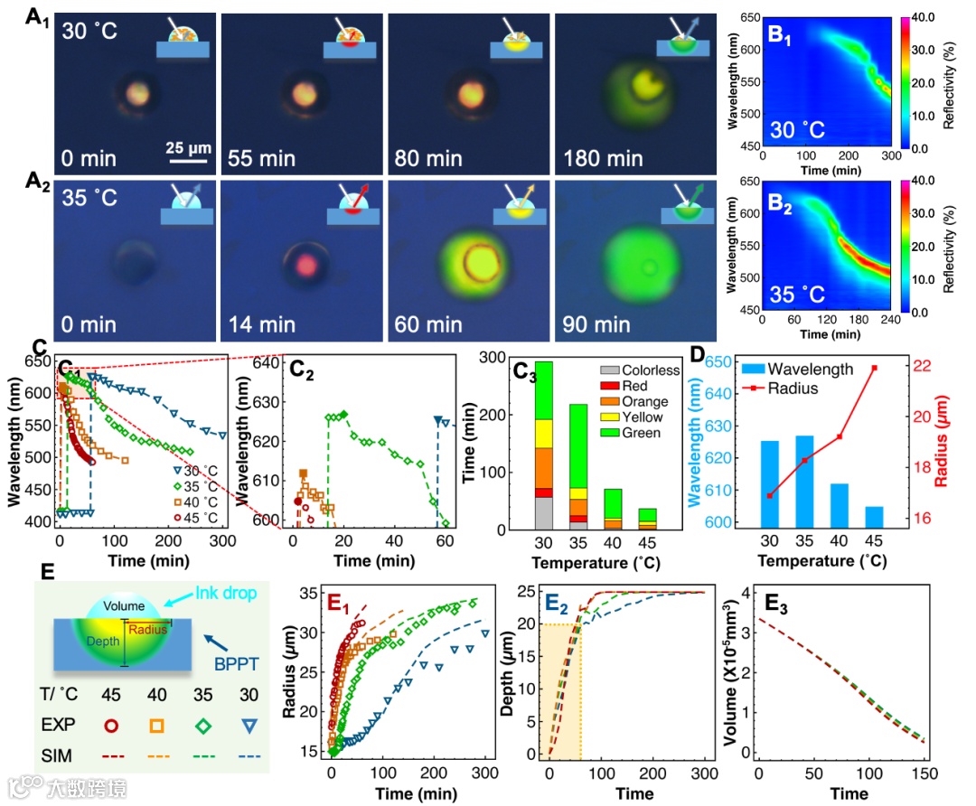 图2. 5CB墨水的渗透行为及不同温度下FAS-BPPT的对应颜色变化过程。A) POM图像和B) 打印点的反射光谱,在A1, B1) 30 ˚C, A2, B2) 35 ˚C时。C1, C2) 打印点的中心波长(λcenter)变化,C3) 打印点的颜色随时间变化。D) 不同温度下打印点的λred和半径。E) 模拟结果:E1) 打印点半径的变化,E2) 墨水的渗透深度,E3) 不同温度下基底表面墨水剩余体积随时间变化。随着温度升高,打印点的红/蓝移速率增加,导致颜色保留时间缩短。