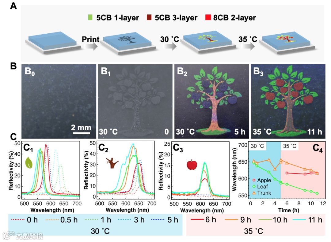图6. 用5CB和8CB打印的“生长中的苹果树”动态图案。A) 动态多色图案的示意图,通过采用5CB和8CB的多层打印方式实现。B) 照片:B0) BPPT,打印的动态苹果树,B1) 0小时,B2) 30 ˚C下5小时后,B3) 35 ˚C下11小时后。C) 图案的反射光谱:C1) 叶子,C2) 树干,C3) 苹果。C4) 加热时叶子、树干和苹果图案的中心波长(λcenter)变化。