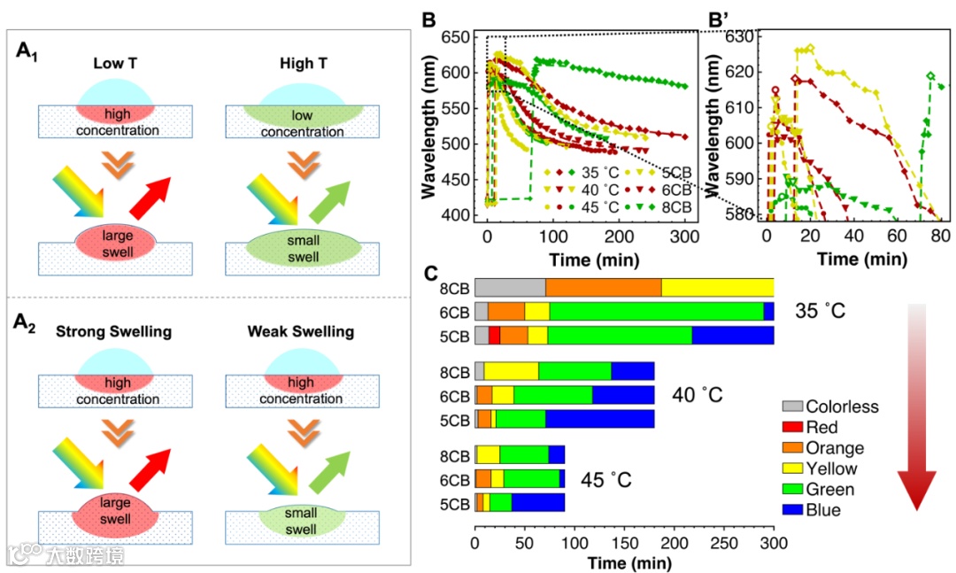 图4. 打印点的动态颜色变化总结,基于墨水类型和温度。A) 不同颜色机制的示意图:A1) 在不同温度下,A2) 使用不同墨水打印时。B) 打印点的中心波长(λcenter)与时间的关系,B') 放大图。C) 打印点的颜色动态随时间变化。对于单一墨水,打印点的红/蓝移速率随着温度升高而增加,从而导致颜色保留时间缩短。对于不同墨水,5CB墨水的打印点表现出最快的颜色变化速率和最宽的颜色变化范围,而8CB墨水的打印点则表现出最慢的颜色变化速率和最窄的颜色变化范围。