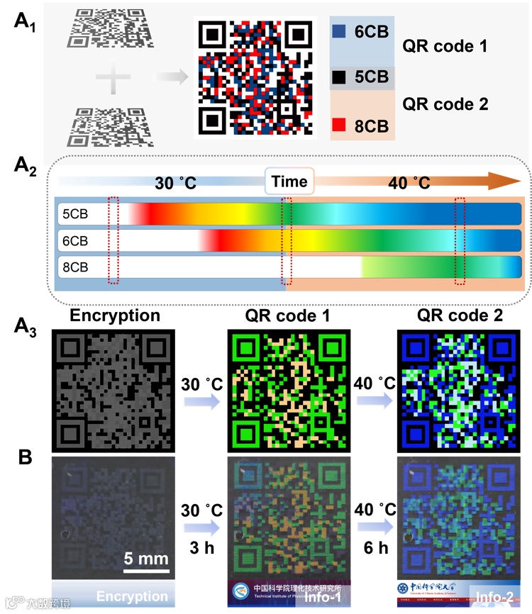 图7. 通过使用5CB、6CB和8CB打印制备的双层二维码动态多级加密。A1) 设计示意图,A2) 5CB、6CB和8CB的颜色变化,A3) 双层二维码的动态变化过程。B) 打印的动态二维码照片,显示第一条和第二条信息。