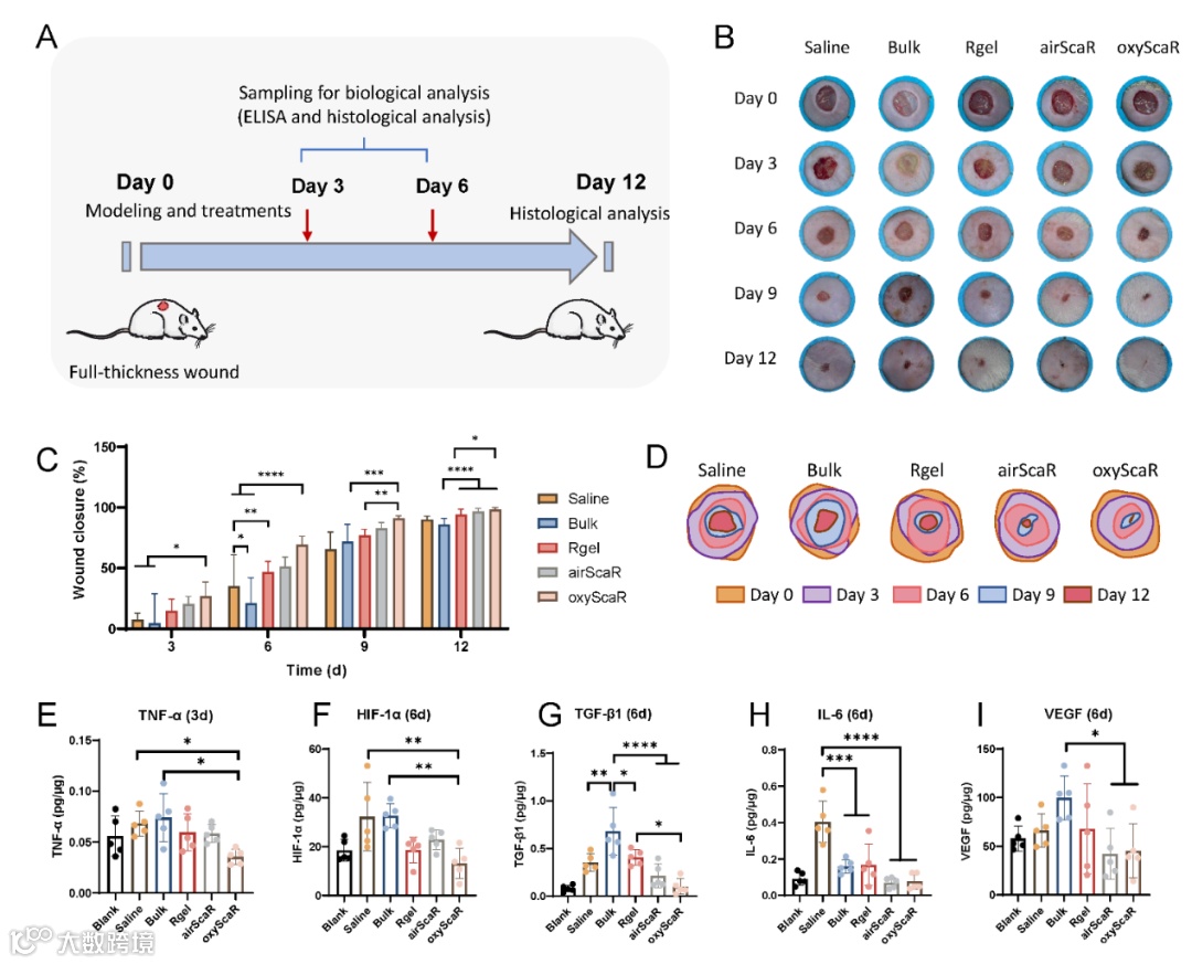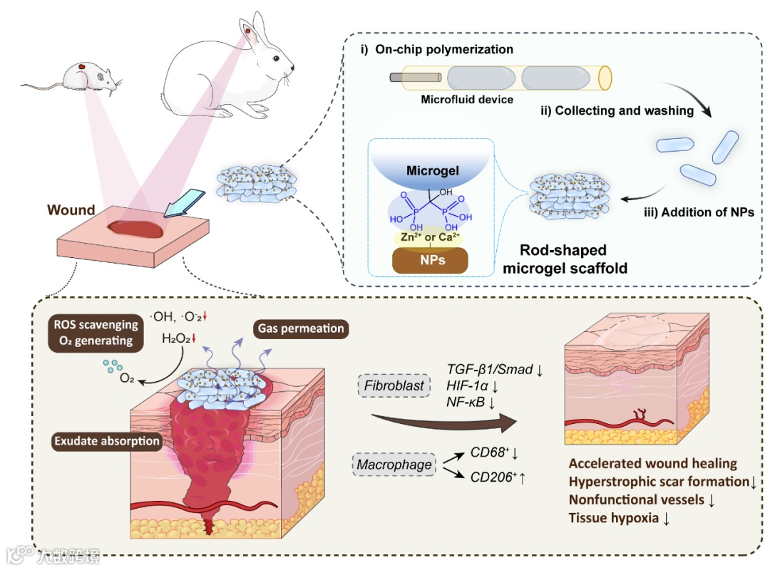 浙江大学高长有教授团队在《Advanced Functional Materials》发表的研究“Rod-Shaped Microgel Scaffolds with Interconnective Pores and Oxygen-generating Functions Promote Skin Wound Healing and Alleviate Hypertrophic Scar Formation”,展示了一种新型棒状微凝胶支架的卓越性能。该研究旨在解决传统伤口敷料在保湿、透气、渗出液吸收以及抗炎抗氧化性能方面的不足。研究团队探索了一种具备大表面积和互联孔隙结构的棒状微凝胶支架,这种支架能够显著提升气体透过能力,从而改善伤口供氧,保持湿润。此外,研究通过纳米颗粒介导微凝胶组装支架的形成,并加载过氧化氢酶(CAT),以进一步增强其生物活性。通过改善保湿、透气性能、渗出液吸收能力以及抗炎抗氧化效果,该支架在伤口愈合的关键阶段提供了理想的微环境,不仅显著加快了伤口愈合速度,还有效减轻了愈合后瘢痕的形成。
