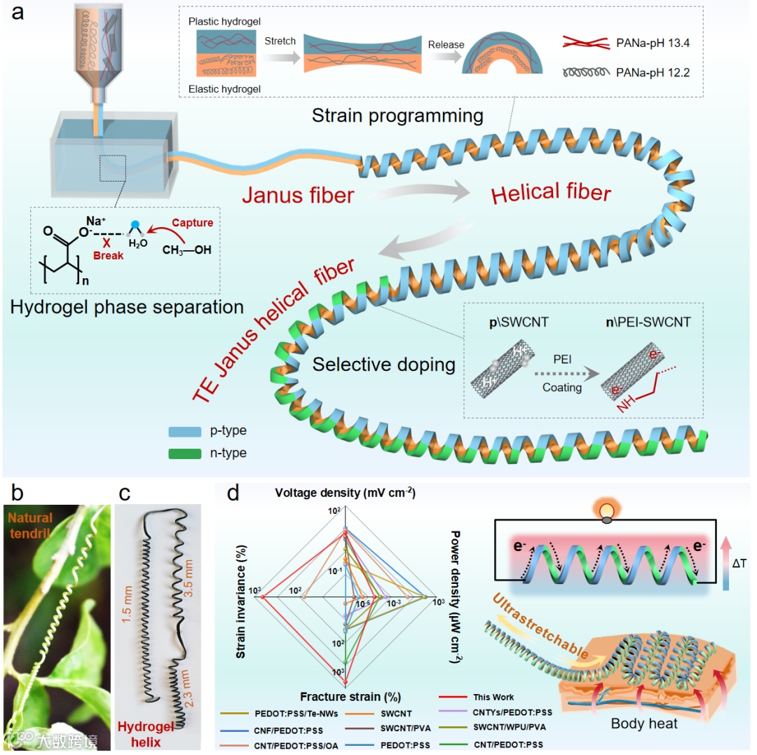 受植物卷须结构的仿生启发,本研究创新性地设计并制备了一种具有Janus异质结构的热电螺旋水凝胶纤维。该纤维在超高应变条件下展现出卓越的结构稳定性,能够完全保持其原始热电性能。基于生物应变失配机制,研究团队成功开发了一种可规模化制备的Janus螺旋纤维,该纤维由聚丙烯酸钠(PANa)和聚丙烯酸钠/单壁碳纳米管(PANa-SWCNT)复合水凝胶构成,并实现了螺旋直径的可调控性。实验结果表明,经过优化的螺旋纤维具有优异的超拉伸性能,其内置温度梯度和电阻值在高达650%的应变条件下仍能保持恒定,从而确保了热电纤维的稳定能量输出性能。进一步地,通过集成90对p/n螺旋热电水凝胶纤维,成功构建了自适应热收集系统,该系统实现了6.51 mV cm-2的电压密度输出。值得注意的是,该器件展现出优异的环境温度感知能力,其灵敏度达到-176 μV/℃,且该性能不受人体运动的影响。