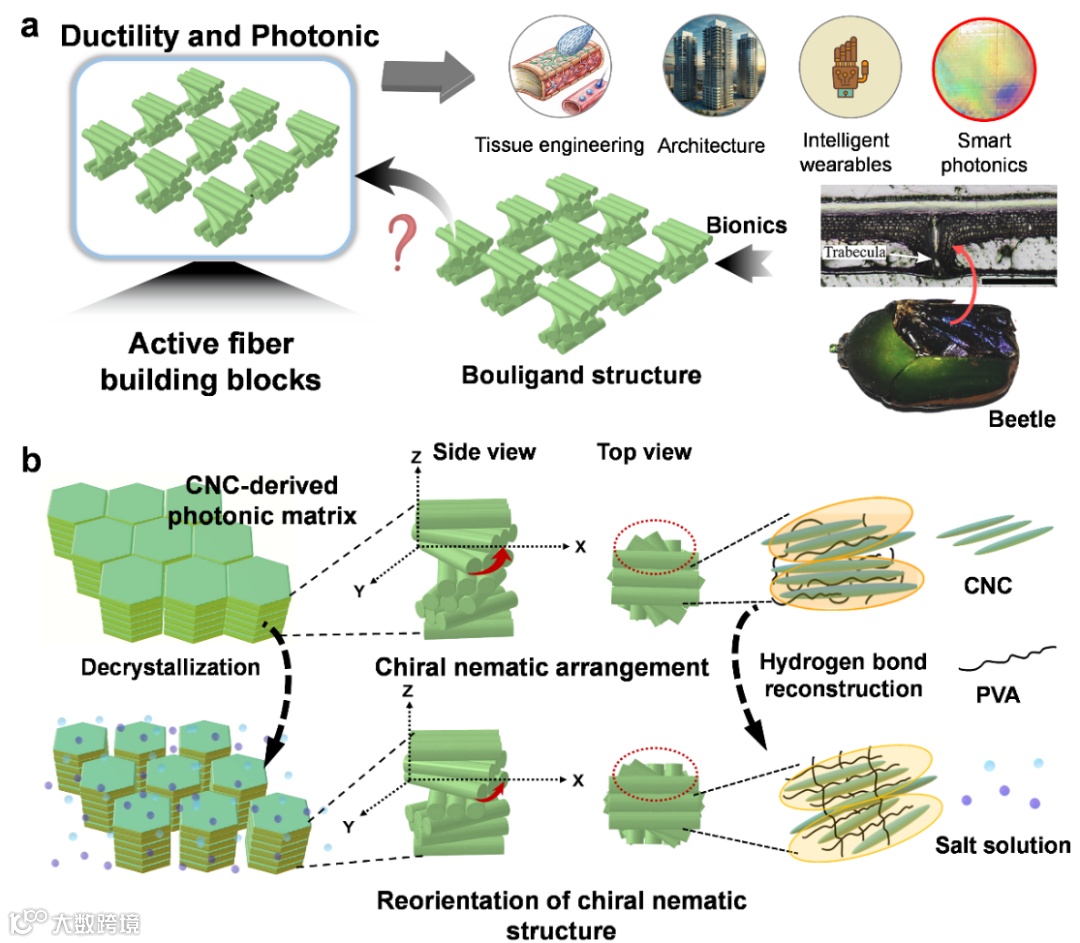 仿生Bouligand结构具有变革性的潜力,可在从生物塑料和建筑到航空航天的尖端领域开发高性能纳米复合材料。尽管自组装策略衍生的结构具有一定的反应性,但所得结构的纤维间界面中受限的平衡稳健性和微运动限制了延展性。这种限制阻碍了它们在各个领域的实际应用,例如组织工程、智能可穿戴设备和程序化制造(图 1a)。因此,追求一种可以通过纳米纤维滑动或氢键重建利用具有多级活化界面的纤维组件的系统,对于推进结合多种增韧机制的仿生Bouligand结构材料构成了一个重大问题。纤维素纳米晶体(CNC)自组装成高度有序的Bouligand结构,表现出手性光子特性,可以根据结构-性质-功能关系进行调整。这些纳米晶单元通常被限制在几百纳米的尺寸内,因此其生物聚合物网络基质的空间排列可以通过氢键进行调节,为上述问题提供了实用的解决方案。