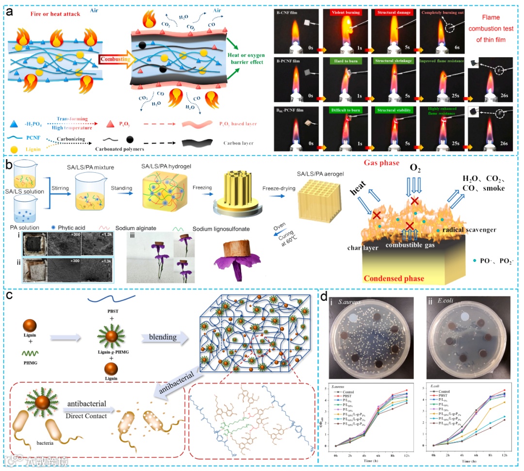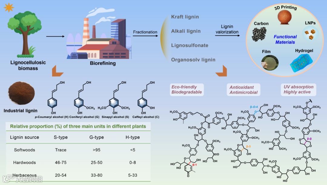 图1.不同原料中木质素的基本结构和组成,以及不同木质素基功能复合材料