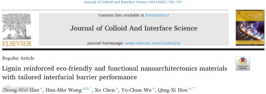 基于此,天津科技大学侯庆喜教授团队从木质素基复合材料的界面多重阻隔性能角度出发,对该类环保型功能复合材料进行了系统地总结。该工作以题为“Lignin reinforced eco-friendly and functional nanoarchitectonics materials with tailored interfacial barrier performance”发表在国际学术期刊《Journal of Colloid And Interface Science》上,天津科技大学硕士生韩忠伟为文章第一作者,天津科技大学侯庆喜教授和王汉敏副教授为通讯作者。