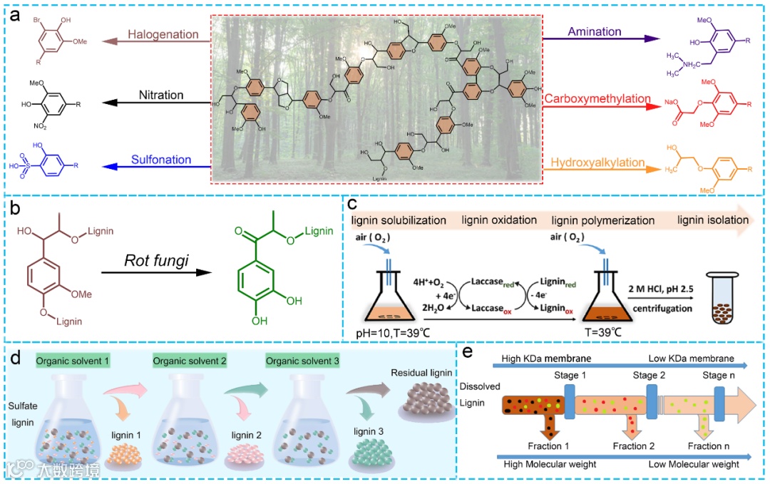 为了更好地利用木质素,研究者们采用多种方法对其结构进行调控。其中,化学改性方法,例如通过酚化、醚化、卤化等反应,可以改变木质素的分子结构,提高其加工性能;生物处理利用微生物或酶,可以选择性地修饰木质素结构;有机溶剂/膜分级则根据木质素的分子量和功能基团富集程度进行分级,最终获得具有特定性能的木质素组分(图2)。