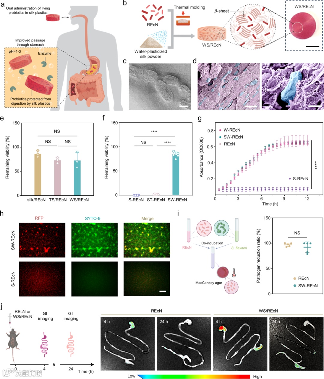 图4: 活性丝蛋白塑料可实现对益生菌的高效保护及体内的高效递送。