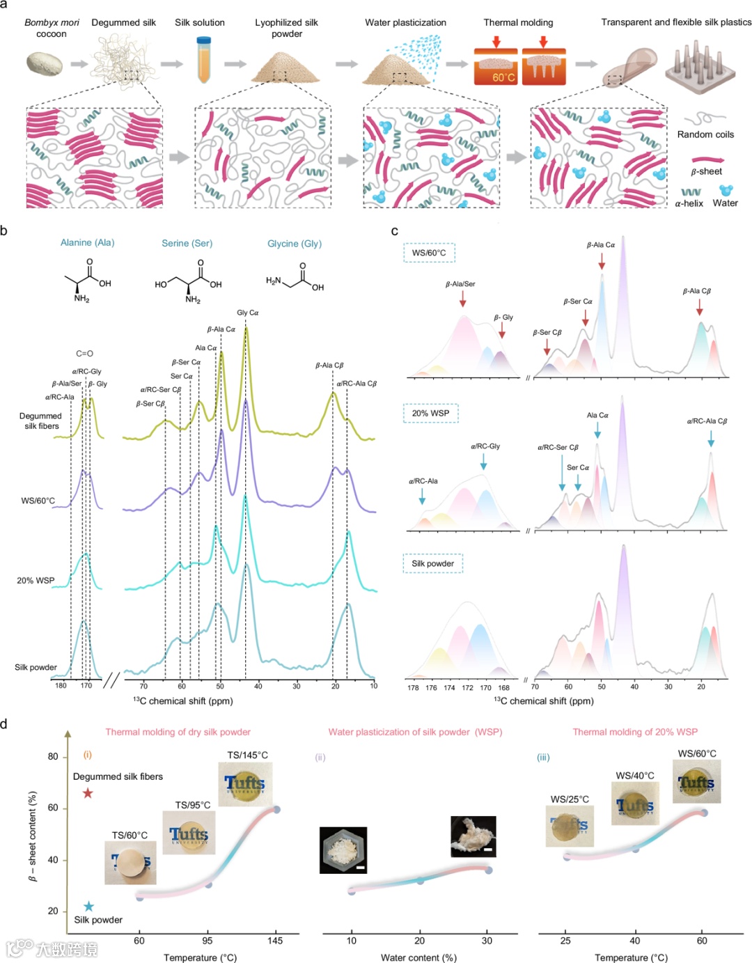 图2: 丝蛋白塑料的制备过程与构象转变。