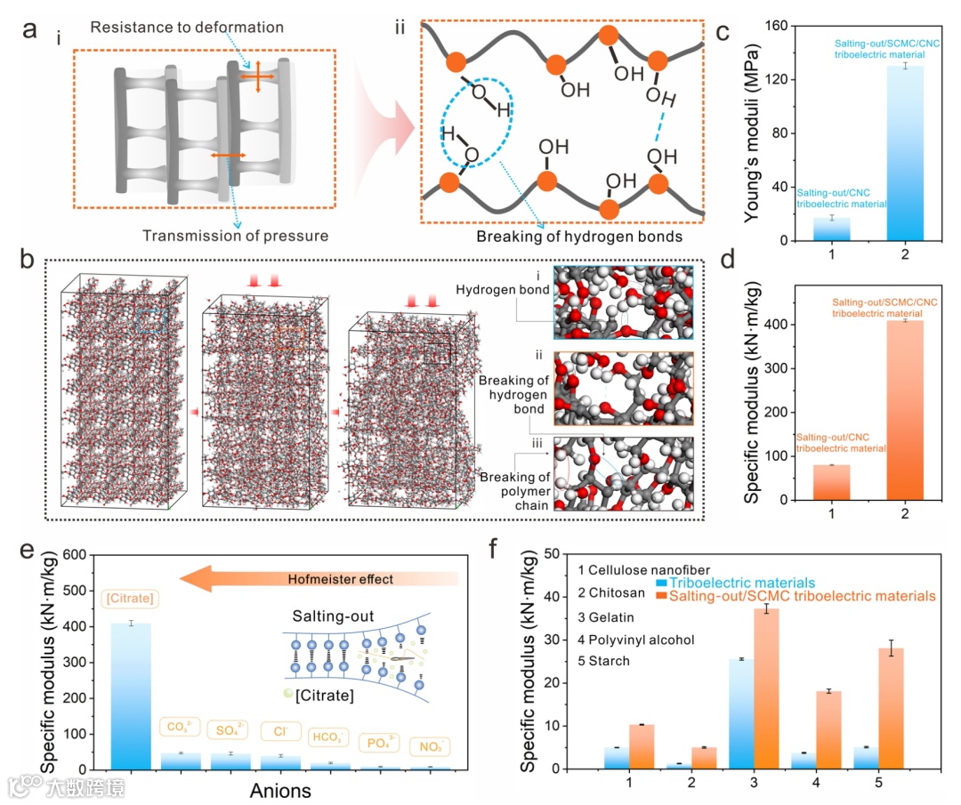 近日,王双飞院士团队基于一种跨尺度强化机制的设计策略,赋予了纤维素摩擦电材料高刚度特性,使得其能够承受自身16600倍以上的重量而不发生任何形变。首先通过定向冰模板法得到具有“墙-隔膜”微米级仿生多孔结构,然后通过盐析作用促进了聚合物分子链之间形成更多的氢键。这使得摩擦电材料的杨氏模量为130.3 MPa,比模量为409.0 kN m/kg,即使在735.5 kPa压强冲击下仍能稳定工作。