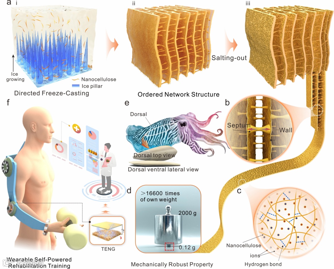在本研究中,摩擦材料的设计策略基于一种跨尺度强化机制。首先通过冰模板法构建“墙-隔膜”仿生结构,赋予材料有序网络结构;进一步通过盐析作用增强了分子链之间氢键作用,最终赋予纤维素气凝胶基摩擦电材料高刚度特性。仿生结构受到了墨鱼骨的启发,墨鱼骨是墨鱼内部的一种轻质多孔的生物矿化壳,主要是由背盾和腹侧的腔体组成。在背腹垂直剖面中,每个腔室都由复杂的水平隔膜及垂直壁组成,这种结构组成赋予墨鱼骨优异的耐损伤性。