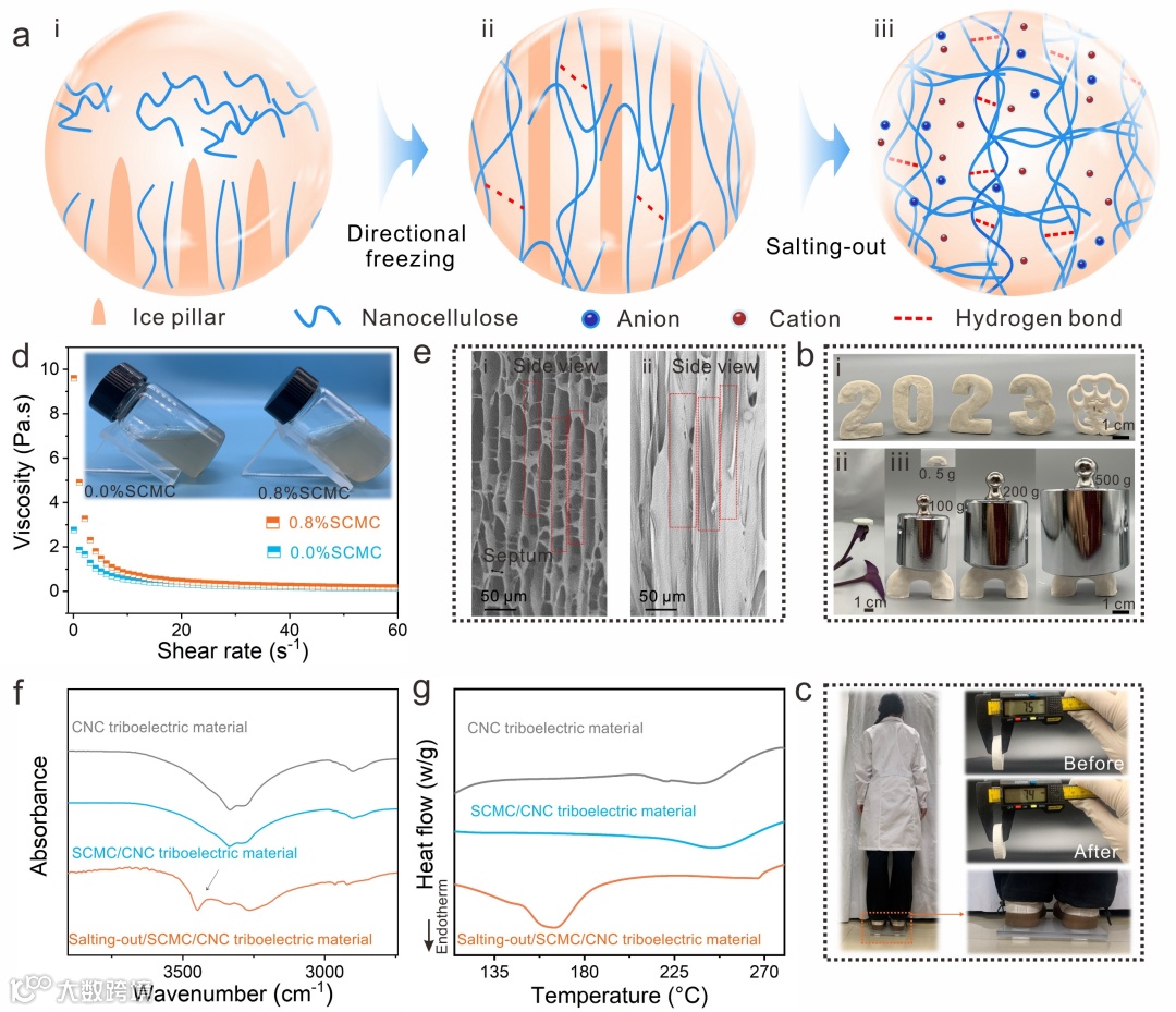 首先,将纤维素纳米晶(CNC)聚合物悬浮液进行定向冷冻,然后直接浸入柠檬酸钠盐溶液中;将盐析后的凝胶进行冷冻,再经冷冻干燥得到Salting-out/SCMC/CNC气凝胶。在定向冷冻过程中,移动的水-冰晶将推出聚合物,并将其限制在冰晶间隙区域(以及冰晶中),从而实现“墙-隔膜”仿生结构的构建。在随后的盐析过程中,盐析效应进一步引起聚合物分子链之间的氢键作用的改变,强化了有序网络结构,显著提高了材料的力学性能。“墙-隔膜”有序网络结构是通过控制悬浮液中聚合物运动速率实现的。通过羧甲基纤维素钠(SCMC)调控了悬浮液的粘度,其中添加SCMC(质量分数仅为0.8%)后,聚合物悬浮粘度明显增大。粘度的增加抑制了聚合物的运动速率,在同样的冷冻温度条件下,“墙-隔膜”的仿生结构更易生成。
