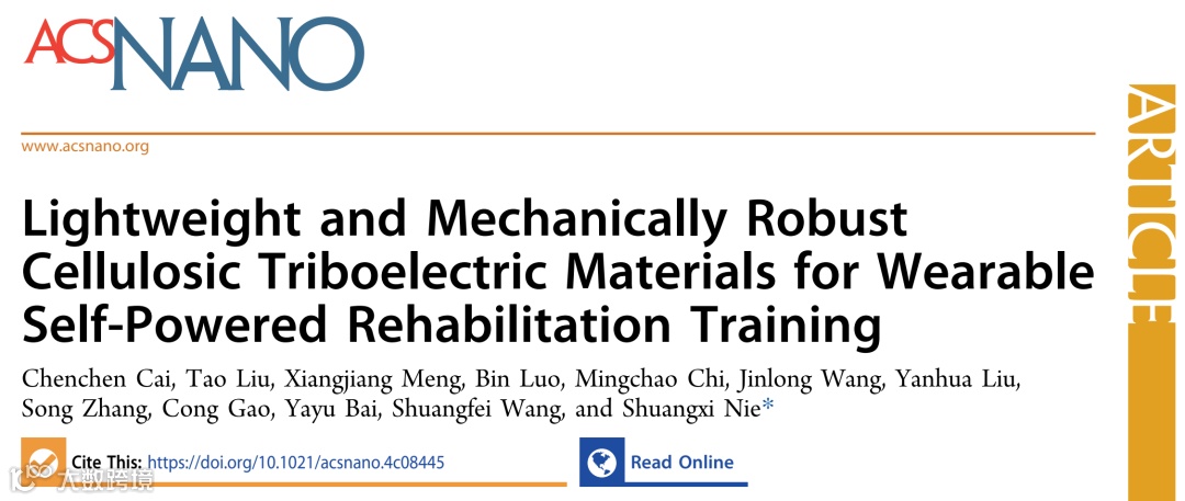这项成果以题为《Lightweight and Mechanically Robust Cellulosic Triboelectric Materials for Wearable Self-Powered Rehabilitation Training》发表在最新一期《ACS Nano》期刊上,博士后蔡晨晨为本研究的第一作者,聂双喜教授为通讯作者,刘涛、蒙香江、罗斌、迟明超、王金龙、刘艳华、张松、高聪、白亚宇等参与研究。