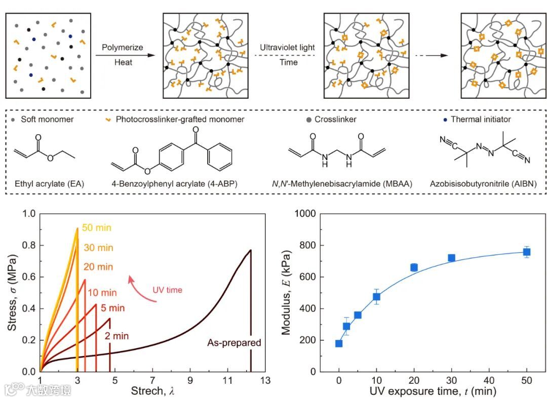 本工作首先通过热引发的自由基聚合形成均匀而稀疏交联弹性网络。网络中集成了潜伏的光引发交联基团(图2),用于后续区域化网络的模量。