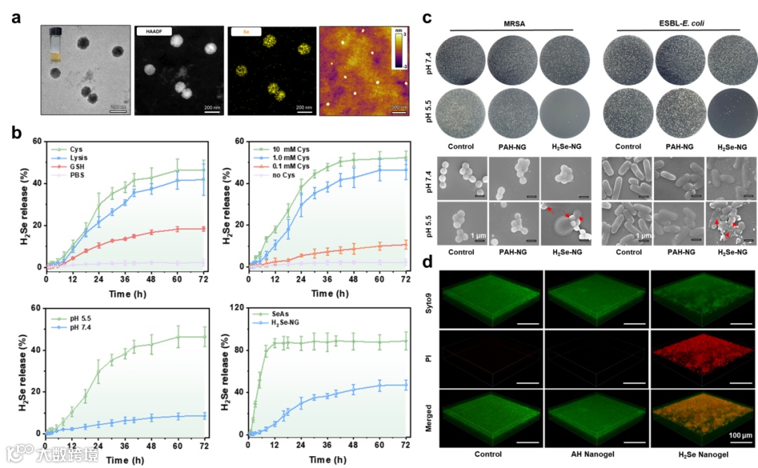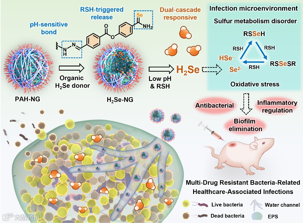 近期,西北工业大学李鹏/王腾蛟团队开发了一种基于有机硒化氢供体的新型抗菌气体疗法,通过有机供体分子设计及高分子载体结构优化实现H2Se气体按需缓释,进而达到治疗耐药菌及其生物被膜感染目的(图1)。在该研究中,团队首先将硫醇(RSH)触发H2Se释放的硒苯甲酰胺有机小分子H2Se供体进行醛基化修饰,并通过配方优化制备了含有丰富酰肼基团的聚(乙二醇-co-丙烯酰肼)纳米凝胶(PAH-NG)。随后,在水相环境下通过pH敏感的酰腙键结合,成功制备了硒化氢递送纳米凝胶(H2Se-NG),从而平衡其生物相容性和抗菌性能。通过模拟生物被膜感染微环境,H2See-NG表现出级联响应感染微环境低pH和RSH过表达的H2Se释放行为,实现了长达72小时的持续释放。
