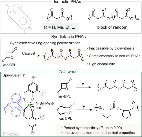 聚羟基烷酸酯(PHAs)最初是在微生物中发现并分离出来的,由于其可持续性、生物降解性和生物相容性,已经被广泛用于一次性包装制品等领域。目前PHAs的工业合成主要依赖于生物合成途径。然而,生物合成PHAs材料具有单一立体化学结构,大大限制了该类材料的使用范围。通过化学合成往往可以得到不同立构规整性聚合物,长期以来的策略就是通过改变催化剂结构从而生成不同立构规整性聚合物。然而从头设计催化剂往往需要繁琐的过程,同时很难得到各种不同规整度的聚合物材料。如何高效构建不同规整度聚合物一直是高分子合成领域的重要挑战。