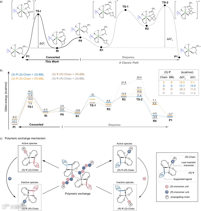 最后作者对聚合反应历程进行了DFT计算,以进一步了解其机理 (图5)。计算结果显示,在 rac-Y体系中,活性较低且立体选择性较低的 (S)-Y-(R)- 链中间体可以与其对映体对 (R)-Y-(S)- 链进行快速链交换,生成活性较高中间体 (S)-Y-(S)- 链和 (R)-Y-(R)- 链,以进一步进行立体选择性链增长 (图 5c)。DFT计算和实验结果共同阐明了外消旋螺环salen催化剂的明确立体调控机制。