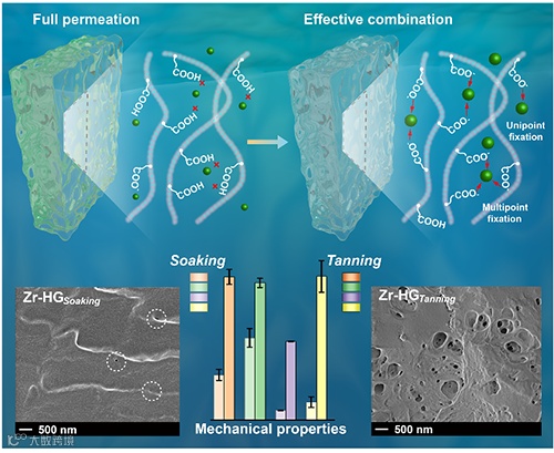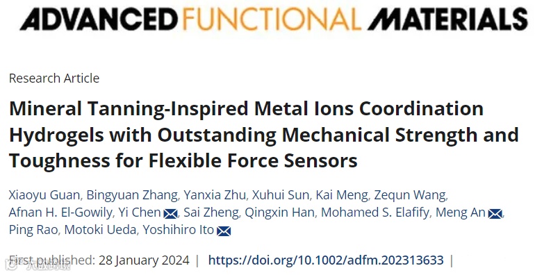 柔性电子传感器具有良好的柔韧性、延展性,且结构形式灵活多样,在电子皮肤、医疗保健、电工、运动器材、纺织品、航天航空、环境监测等领域受到广泛应用。在众多柔性传感材料中,以金属离子为导电介质、聚合物凝胶为柔性衬底的金属配位水凝胶得到广泛的关注。然而,大部分合成的金属配位水凝胶因内在结构非均匀性或有效耗能机制不足导致其力学强度较弱且韧性不足。为此,陕西科技大学王学川教授团队官小玉等人提出基于制革矿物鞣“先渗透-后结合”机制调控金属配位水凝胶结构以大幅提升强韧性的新理念和策略,相关产品可用于智能手套/鞋垫、电子地板、关节运动监测、扁平足矫正、实时降雨监测、触觉神经等柔性电子传感领域。相关研究成果发表在Advanced Functional Materials, 2024, 34(21): 2313633;Advanced Functional Materials, 2024: 2414016;Chemical Engineering Journal, 2024, 489: 151353;ACS Applied Materials & Interfaces, 2024, 16(4): 5168-5182;International Journal of Extreme Manufacturing, 2024(预接收)。以上工作的实验部分主要由研究生朱晏霞、郑赛、张炳原同学完成,陕西科技大学官小玉副教授为论文第一作者(通讯作者),通讯作者还包括陕西科技大学王学川教授、韩庆鑫副教授,四川大学陈意教授,东京大学安盟研究员,日本理化学研究所Ito教授、EI-Gowily研究员。